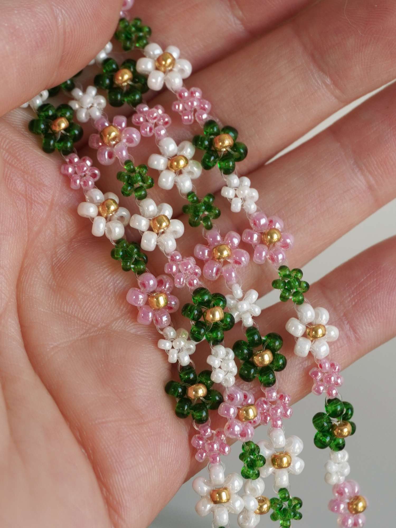 • Un bracelet double en perles en verre colorées en forme de petites fleurs